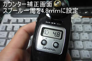 <クリスティアCRのカウンター補正(設定)方法> カウントボタン長押し → カウントボタンを2回押します すると写真の画面になり○内のLの部分が点滅しています。 この状態で入/切ボタンを 押す事で2mmごとにスプール1回転の カウンター表示の距離を設定できます。 ※ 計算方法 巻いてあるPEの長さ(メートル表示があるならその表示分を) 引き出してスプールが何回廻るか数えます。 メーター数÷回転数=スプール一回転分の距離 私の場合1m引き出してスプールが20回と半周強 ぐらい 周りましたので100mm÷20.7=約48mmって事にして 4.8で設定しました。 ⇒詳しくはコチラ |