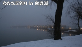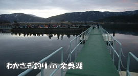 琵琶湖の上部にたんこぶの様に接している小さな 湖余呉湖を紹介します。^^ コチラも入鹿池と同様放流されたわかさぎを 釣る訳ですが、コチラの釣り場の釣り方は 珍しくボートは使いません^^岸から釣る訳でも ありません^^ ここの釣り場の釣り方は、岸から長く伸びた桟橋上に 3マス用意されている海上釣り堀さながらのマス状の イカダから釣りをします。^^ |